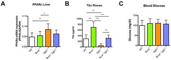 Differences in lipid metabolism in Bvra−/− or Ugt1−/− mice are absent in the Bvra−/−Ugt1−/− double knockout mice. (A) Hepatic PPARα mRNA levels in 9-months-old mice. Data represent the mean ± SD (both genders are plotted together). One-way ANOVA, p = 0.005, F = 5.071; Bonferroni tests: *, p ≤ 0.05; **, p ≤ 0.01; WT vs. Bvra−/−Ugt1−/−, ns; (B) triglycerides levels (µg/mL) in serum of 9-months-old animals. One-way ANOVA, p ≤ 0.0001, F = 39.19; Bonferroni tests: **, p ≤ 0.01; ***, p ≤ 0.001; WT vs. Bvra−/−Ugt1−/−, ns; (C) glucose levels (mg/dl) in fasted 9-months-old animals. One-way ANOVA, p = 0.7094, F = 0.4642, ns.