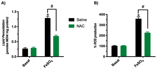 Effect of subchronic NAC administration on brain lipid peroxidation and ROS production induced by the pro-oxidant FeSO4 in vitro. Brain tissues were obtained from mice treated i.p. with saline or NAC (100 mg/kg/day). See Materials and Methods for experimental details. (A) Basal status of lipid peroxidation and effect of FeSO4 (5 µM). (B) ROS formation, expressed as a percentage of control values, under basal conditions and after exposure to FeSO4. Data are the mean ± SEM (n = 10 for each of the 4 groups). Two-way ANOVA was performed for lipid peroxidation and ROS with pairwise comparisons using Tukey’s adjusted p-values. * p < 0.05 vs. basal saline and # p < 0.05 vs. saline + FeSO4.