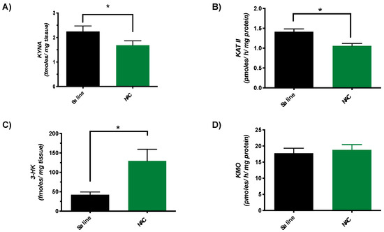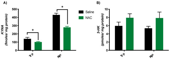Brain tissue from 10 animals per group (saline and NAC) was weighed while frozen and then homogenized (1:10, w/v) in Krebs buffer (pH 7.4). The homogenate was diluted (1:2, v/v) in 100 mM Tris-HCl buffer (pH 8.1) containing 10 mM KCl and 1 mM EDTA. One hundred µL of the preparation was incubated for 2 h at 37 °C in a solution containing 1 mM NADPH, 3 mM glucose-6-phosphate, 1 unit/mL glucose-6-phosphate dehydrogenase, 100 µM Kyn, 100 mM Tris-HCl buffer (pH 8.1), 10 mM KCl, and 1 mM EDTA in a total volume of 200 µL. The reaction was stopped by the addition of 50 µL of 6% perchloric acid. Blanks were obtained by boiling the samples for 10 min. After centrifugation (14,600× g, 10 min), 100 µL of the supernatant were applied to a 3 µm Adsorbosphere C18 reverse phase column (4.6 × 100 mm; Thermo Fisher Scientific, Waltham, MA, USA), using a mobile phase consisting of 1.5% acetonitrile, 0.9% triethylamine, 0.59% phosphoric acid, 0.27 mM EDTA, and 8.9 mM sodium heptane sulfonic acid and a flow rate of 0.6 mL/min. In the eluate, the reaction product, 3-HK, was detected electrochemically using a LC-4C detector (BAS, West Lafayatte, IN, USA) oxidation potential: +0.5 V). The retention time of 3-HK was ~11 min.