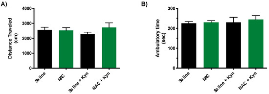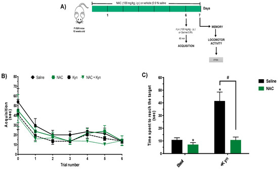 To further examine the effect of subchronic NAC administration on cognitive performance, separate groups of mice received an injection of Kyn (100 mg/kg, i.p.) 60 min prior to the training session on Day 6 to acutely raise cerebral KYNA levels, which are known to disrupted learning and memory process [19]. Mice injected with Kyn (i.e., subchronic saline + Kyn and subchronic NAC + Kyn) showed no difference in learning (acquisition), i.e., the animals reduced the time spent to reach the target location in a similar fashion (Figure 4B). However, memory performance was severely impaired in subchronic saline + Kyn animals; the time spent to reach the target location was almost three times higher (41.5 ± 7.1 s) than in controls (10.8 ± 1.7 s). Notably, however, Kyn did not impair memory in mice that had been pretreated with NAC (41.5 ± 7.1 vs. 10.7 ± 2.3 s, respectively) (Figure 4C).