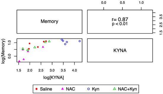 Finally, we analyzed whether the effect of NAC on KYNA levels correlated with cognitive performance. As illustrated in Figure 6, there was a positive association between reduced brain KYNA levels and improved memory performance (expressed as the time spent to find the target), suggesting that subchronic NAC administration improves memory performance and prevents the cognitive impairment induced by an acute Kyn administration at least in part by decreasing brain KYNA levels.