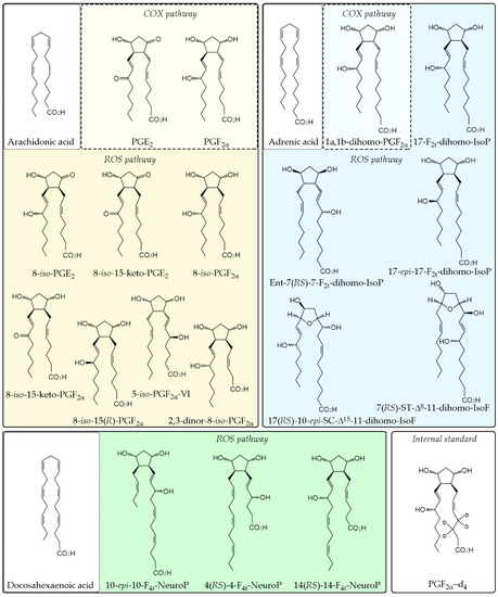 Chemical structure of analytes and internal standard. The analyzed PUFAs derived from arachidonic acid, adrenic acid and docosahexaenoic acid through cyclooxygenase (COX) pathway and/or non-enzymatic peroxidation are separated in different color boxes.