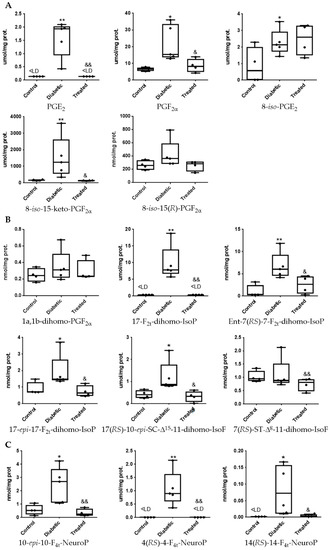Boxplots of lipoperoxidation analytes in retina samples from control, diabetic and treated group. Lipid peroxidation compounds derived from (A) arachidonic acid, (B) adrenic acid and (C) docosahexaenoic acid. Boxes indicate the 1st and the 3rd quartiles, the median is shown as a black line, whiskers mark the maximum and the minimum values. Values below the limit of detection were replaced by the number of quantification limit indicated by (<LD). The statistical difference is indicated as * < 0.05 vs. control, ** < 0.01 vs. control, & < 0.05 vs. diabetic, && < 0.01 vs. diabetic.