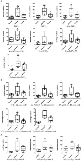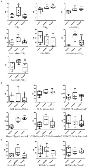 Boxplots of lipoperoxidation analytes in plasma samples from control, diabetic and treated group. Lipid peroxidation compounds derived from (A) arachidonic acid, (B) adrenic acid and (C) docosahexaenoic acid. Boxes indicate the 1st and the 3rd quartiles, the median is shown as a black line, whiskers mark the maximum and the minimum values. Values below the limit of detection were replaced by the number of quantification limit indicated by (<LD). The statistical difference is indicated as * < 0.05 vs. control, ** < 0.01 vs. control, *** < 0.001 vs. control, & < 0.05 vs. diabetic, && < 0.01 vs. diabetic, &&& < 0.001 vs. diabetic.