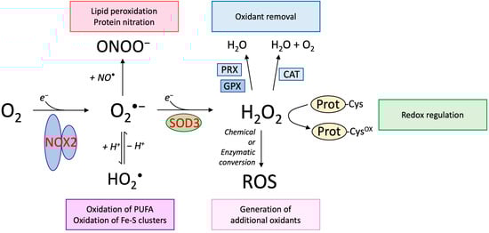 Biological impact of superoxide and hydrogen peroxide. The univalent reduction of molecular oxygen (O2) generates the superoxide radical (O2•−) and is enzymatically catalyzed by the NOX protein family, including NOX2. In biological systems at a physiological pH, superoxide is in equilibrium with the perhydroxyl radical, representing the protonated form of superoxide. Although the perhydroxyl radical only represents below 1% of superoxide at neutral pH, it is likely that this radical mediates some of the damaging impact of superoxide, indicated to include oxidation of polyunsaturated fatty acids (PUFA) and Fe-S clusters in proteins. Superoxide also participates in a very fast reaction with nitric oxide (NO•), which is also a radical. The reaction generates peroxynitrite (ONOO−), which supports oxidative reactions including lipid peroxidation and protein nitration. Hydrogen peroxide (H2O2) is generated by the univalent reduction of superoxide, a process that may proceed spontaneously or catalyzed by superoxide dismutase enzymes, including SOD3. Hydrogen peroxide is not a radical and express in general a low propensity to react with biomolecules. The oxidant may be removed by peroxiredoxins (PRX) and glutathione peroxidases (GPX), both expressed as distinct isoforms in cellular compartments. Moreover, catalase (CAT) present in peroxisomes is also capable of removing hydrogen peroxide. Specific redox-sensitive proteins display highly reactive cysteine residues (Prot-Cys) that may be oxidized by H2O2 to regulate biological activity (Prot-Cysox), a process referred to as redox regulation. Hydrogen peroxide may also fuel the formation of other oxidants established by chemical or enzymatic conversion. See main text for further details.