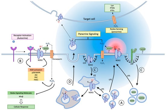 Membrane trafficking and Redox signaling of NOX2 and SOD3. In blood-derived macrophages and tissue macrophages, NOX2 and SOD3 are contained in separate agonist-responsive secretory vesicle populations distinct from, but communicating with, the endosomal compartment (A). Inflammatory activation (e.g., LPS) of macrophages causes mobilization and exocytosis of the vesicles to enrich the cell surface in superoxide production capacity (red sphere). On the cell surface NOX2 is organized in lipid rafts, and the agonist-induced planar inclusion of also SOD3 into this ensemble drives a rapid dismutation of superoxide to establish a steep gradient of hydrogen peroxide (blue sphere) for autocrine and paracrine signaling. Peroxiporin channels are likely also included in lipid rafts, which facilitates redox signaling by allowing hydrogen peroxide easier access to redox targets in the cytosol of the producing cell (autocrine) or in nearby cells (paracrine mode). Certain cell surface receptors signal directly or indirectly through redox circuits (B). Proximal signaling from the receptor causes activation of various NOX2 activators, and in the presence of SOD3 the ensuing hydrogen peroxide production amplifies, sustains and diversifies receptor signaling. NOX2-derived oxidants may also directly target a growing number of intracellular redox sensors e.g., nuclear factor kappa-light-chain-enhancer of activated B cells (Nf-kB) to induce altered signaling and transcription. Both NOX2 and SOD3 are internalized from the cell surface through clathrin-coated pits, and reach their respective storage compartments by unknown endosomal sorting mechanisms (C). A minor fraction of NOX2 will continuously be present in endosomal compartments and on the cell surface, but immune cell activation increases cell surface exposition of NOX2 and SOD3 several-fold by mobilization of secretory vesicles. The fraction of NOX2 in the endosomal pool is functionally important because NOX2, in an assembled and active format, can be sorted into intraluminal vesicles of multivesicular bodies/late endosomes, which are then discharged into the surroundings by exocytosis as exosomes (D). Exosomes can now confer novel oxidant production capacity to neighboring target cells, after fusion with their plasma or endosomal membranes to insert the NOX2 complex.