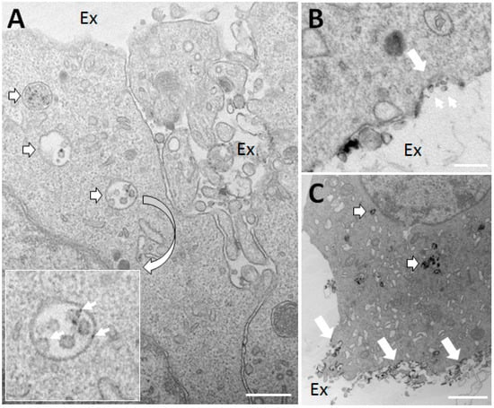 PC12 nerve cells in the process of differentiation secrete exosomes with oxidant production capacity. (A,B) PC12 neuron-like cells under differentiation induced by nerve growth factor (NGF) for four days were treated with phorbol myristate acetate (PMA) for one hour (to activate NADPH oxidase) in the presence of cerium chloride (CeCl3), a cytochemical agent, which forms an electron-dense precipitate upon reaction with hydrogen peroxide. (A) Note the presence of multivesicular bodies/late endosomes (outlined white arrows) containing intraluminal vesicles (exosomes to be) with clear deposition of CeCl3 (see inset) indicative of hydrogen peroxide production. Ex, extracellular space. (B) A profile suggesting the exocytosis of a late endosome (large white arrow) leading to the release of exosomes with hydrogen peroxide production (small arrows). (C) In addition to activating NOX2, PMA is a strong secretagogue. After three hours of PMA stimulation a countable number of late endosomes are clearly stained with CeCl3 precipitates (outlined white arrows), and substantial amounts of material with precipitate is seen deposited on the cell surface following their exocytosis (large white arrows). Bars, 250 nm in (A,B); 2 μm in (C).