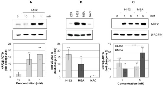 Previous evidence indicates that 10 mM I-152 causes GSH depletion in RAW 264.7 cells but yields a high content of thiol species in the form of NAC, MEA and I-152. By contrast, 1 mM I-152 increases cellular GSH content [27]. Thus, this range of concentrations was initially used to test whether the molecule is able to activate the NRF2 signaling pathway, considering that both MEA and NAC have been reported as potential NRF2 activators [31,32].