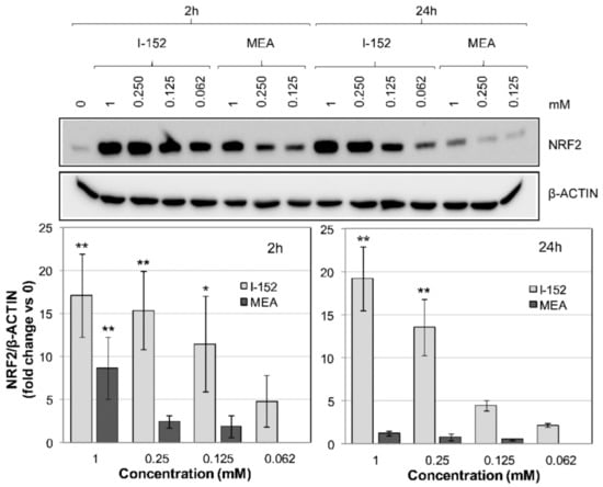 To compare the potency of I-152 and MEA we subsequently performed dose-dependent experiments at concentrations equal to and below 1 mM. MEA is typically used in vitro at concentrations ranging from 1 mM to 0.05 mM [33,34], while doses up to 10 mM of NAC can be found in literature [35]. A stronger activation of NRF2 was observed in I-152-treated cells than in those incubated with MEA (Figure 2). Indeed, after 2 h, only 1 mM MEA significantly increased NRF2 levels over the basal level, while I-152 was effective at concentrations as low as 0.125 mM. Moreover, the effects of I-152 were still evident after 24 h incubation, while MEA was no longer effective.