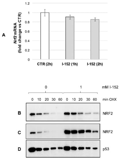 To shed light on the mechanism(s) of I-152-mediated NRF2 intracellular accumulation, Nrf2 gene expression and the rate of protein degradation were determined. After incubation with I-152, Nrf2 mRNA levels were substantially unchanged compared to the control (Figure 3A), allowing us to exclude transcriptional induction. By contrast, co-treatment with cycloheximide, a well-known translational inhibitor, followed by Western blotting analysis revealed that NRF2 protein degradation was significantly reduced in I-152-treated cells compared to untreated cells receiving only CHX (0) (Figure 3B). More marked differences were obtained when CHX was added to the culture medium after 30 min pre-incubation with I-152 (Figure 3C).