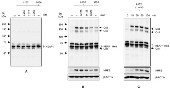 When reduction was omitted, KEAP1 still migrated as a major band of the same molecular mass (denoted by Red for reduced), but a second less intense band with faster mobility (denoted by Ox1 for oxidized form 1) appeared in I-152- and MEA-treated samples, but not in lysates from untreated cells (0) (Figure 4B). Moreover, a 75 kDa immunoreactive species was present in all the samples, independently of the treatment. Finally, two bands (denoted by Ox2 and Ox3) with a much slower mobility than red KEAP1 were evident in the upper part of the non-reducing gel, while they were absent in reduced samples. The intensity of the Ox1, Ox2, and Ox3 bands increased with the I-152 dose and was more pronounced in cells treated with 1 mM I-152 than in those treated with an equimolar concentration of MEA, suggesting that I-152 is a more potent KEAP1 oxidant than MEA (Figure 4B). Notably, NRF2 staining indicated that there was a good correlation between KEAP1 oxidation and NRF2 stabilization, pointing to a cause and effect relationship. The link between KEAP1 oxidation and NRF2 stabilization was further demonstrated by a time course analysis. As shown in Figure 4C, KEAP1 was already strongly oxidized after 15 min incubation with 1 mM I-152, while NRF2 levels were significantly increased over the control levels at 30 min, a time lag which is consistent with the estimated NRF2 half-life between 15 and 30 min [36,37].