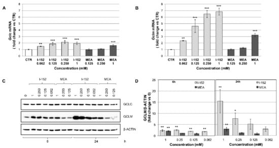 To assess whether accumulation of NFR2 resulted in increased transcriptional activity, the mRNA levels of heme oxygenase-1 (Hmox1), a prototypical NRF2 target gene, Gclc and Gclm were determined by RTqPCR. At 6 h of treatment, all the genes were activated by all the I-152 doses tested and by 1 mM MEA (Figure S2A, Figure 5A,B). The most relevant induction was observed in the case of the Gclm gene (Figure 5B).