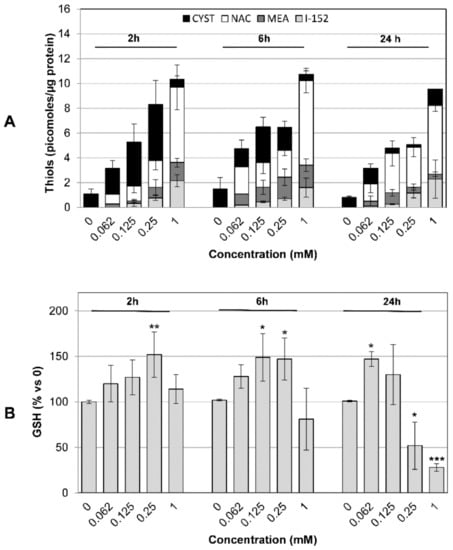 At 2 h incubation, analysis of the free thiol pools showed that cysteine represented the most abundant thiol species, GSH excluded, except in cells treated with 1 mM I-152, where NAC was predominant (Figure 6A). Notably, at 24 h incubation, a predominance of NAC was observed at all the I-152 doses tested. Although I-152 is expected to liberate equimolar concentrations of its metabolites, intracellular MEA levels were markedly lower than those of NAC, suggesting that MEA could be partially converted into cystamine upon oxidation of its sulfhydryl group and/or form mixed disulfides. Such disulfides could not be revealed by the chromatographic analysis used here since it was specific for the identification of –SH carrying molecules. Within the time frame 2–24 h, GSH content dose-dependently increased over the physiological level in cells treated with I-152 (Figure 6B). However, significant depletion of intracellular GSH was observed at 24 h, but only at the highest doses tested (i.e., 0.25 and 1 mM). Thus, I-152 dose-dependently increased intracellular thiol levels: (i) By delivering I-152, NAC and MEA; (ii) by providing high levels of cysteine and (iii) by elevating GSH content.