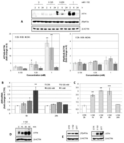 Activating transcription factor 4 (ATF4) transcriptional activation and protein accumulation in I-152-treated cells. (A) Cells were incubated with different concentrations of I-152 for 2 h, 6 h, and 24 h and whole lysates corresponding to 10 μg of proteins were separated on 10% (w/v) polyacrylamide gels. The blots were probed with anti ATF4 and anti [P]eIF2α antibodies. β-ACTIN was stained as a control. Untreated cells receiving only fresh medium served as a control (denoted by 0). Immunoreactive bands were quantified with the Image Lab software. ATF4 and [P]eIF2α levels, normalized to β-ACTIN content, are reported in the graphs as fold change relative to control (0). Values are the mean ± SD of at least three independent experiments. * p < 0.05, ** p < 0.01. (B) RTqPCR analysis of Atf4 mRNA levels in cells treated with different concentrations of I-152 for 6 h and 24 h. (C) RTqPCR analysis of Atf4 mRNA levels in cells treated with 1 mM I-152 for different times. mRNA levels were normalized to the housekeeping genes Gapdh and Gusb and expressed as fold-change versus untreated cells (CTR). The values are the mean ± SD of at least two independent experiments with two technical replicates. * p < 0.05, ** p < 0.01, *** p < 0.001. (D) Cells were incubated with 1 mM I-152 for different times and lysates were resolved by SDS-PAGE, immunoblotted and stained with anti ATF4. (E) Western immunoblotting analysis of cell extracts obtained from CTR cells and cells treated with 1 mM I-152 and 1 mM DTT for 30 min (left panel) and 1 h (right panel). ATF4 and [P]eIF2α were detected using specific antibodies, while β-ACTIN was stained as a loading control.