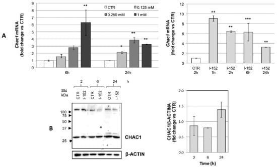 CHAC1 transcriptional activation and protein levels in I-152-treated cells. (A) RTqPCR analysis of Chac1 mRNA levels in cells treated with different concentrations of I-152 for 6 h and 24 h and in cells treated with 1 mM I-152 for different times. mRNA levels were normalized to the housekeeping genes Gapdh and Gusb and expressed as fold-change versus untreated cells (CTR). The values are the mean ± SD of two independent experiments with two technical replicates (B) Cells were incubated with different concentrations of I-152 for 2 h, 6 h and 24 h, and whole lysates corresponding to 10 μg of proteins were separated on 12% (w/v) polyacrylamide gels. The blots were probed with anti CHAC1 antibody. β-ACTIN was stained as a control. Untreated cells receiving only fresh medium served as a control (CTR). Immunoreactive bands were quantified with the Image Lab software. CHAC1 levels, normalized to β-ACTIN content, are reported in the graph as fold change relative to CTR. Values are the mean ± SD of at least three independent experiments. * p < 0.05, ** p < 0.01, *** p < 0.001.