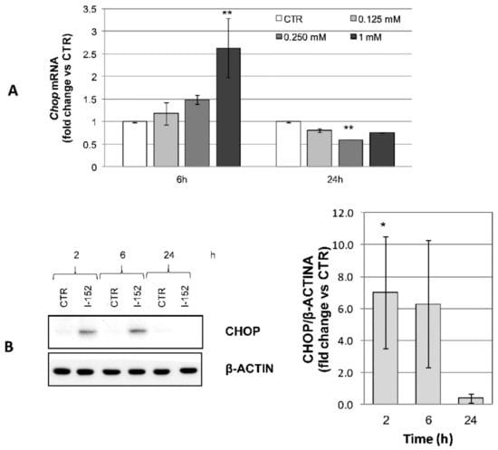 CHOP transcriptional activation and protein expression in I-152-treated cells. (A) RTqPCR analysis of Chop mRNA levels in cells treated with different concentrations of I-152 for 6 h and 24 h. mRNA levels were normalized to the housekeeping genes Gapdh and Gusb and expressed as fold-change versus untreated cells (CTR). The values are the mean ± SD of two independent experiments with two technical replicates (B) Cells were incubated with 1 mM I-152 for 2 h, 6 h, and 24 h and whole lysates corresponding to 20 μg of proteins were separated on 12% (w/v) polyacrylamide gels. The blots were probed with anti CHOP antibody. β-ACTIN was stained as a control. Untreated cells receiving only fresh medium served as a control (CTR). Immunoreactive bands were quantified with the Image Lab software. GHOP levels, normalized to β-ACTIN content, are reported in the graphs as fold change relative to CTR. Values are the mean ± SD of at least three independent experiments. * p < 0.05; ** p < 0.01.