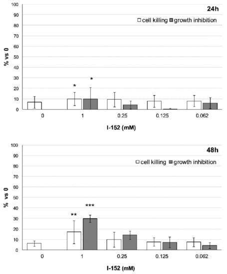 Cell killing and growth inhibition after I-152 treatment. Cells were incubated with different doses of I-152 for 24 h and 48 h. Untreated cells receiving only fresh medium served as a control (denoted by 0). LDH activity was measured for each condition in the cell culture medium and, in parallel, in the medium after complete cell lysis with Triton-X100. This method makes it possible to distinguish cell death versus growth inhibition as described in materials and methods. Data are reported in the graph as fold change relative to control (0). The values are the mean ± SD of two independent experiments with four technical replicates. * p < 0.05, ** p < 0.01, *** p < 0.001.