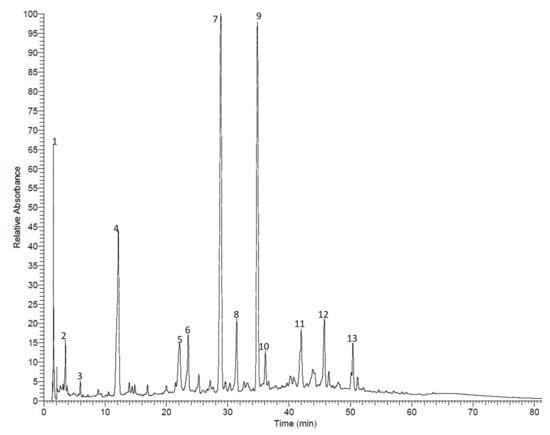 HPLC-PDA chromatogram of the methanol extract from A. anthelmintica leaf. (1) 3-Galloyl-glucose, (2) 2-galloyl-glucose, (3) gallic acid; (4) methyl gallate, (5) hydroxybenzyl-o-galloyl-glucose, (6) coumaroyl-o-galloyl-glucose, (7) quercetin-o-galloyl-glucoside, (8) quercetin glucoside, (9) kaempferol galloyl-glucoside, (10) kaempferol galactoside, (11) quercetin caffeoyl-glucoside, (12) quercetin coumaroyl-glucoside, (13) kaempferol coumaroyl-glucoside. The compounds were identified based on their molecular weights and mass fragmentation patterns, as reported before [13].