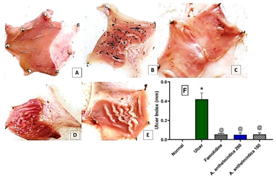 Representative rat stomach photomacrographs that were cut along the greater curvature. (A) Control, (B) indomethacin, (C) reference drug (famotidine), (D) A. anthelmintica extract (200 mg/kg), (E) A. anthelmintica extract (100 mg/kg) representing the substantial existence of many circular and linear gastric ulcers in the indomethacin group, which were significantly reduced by the reference drug (famotidine) and the two tested doses of A. anthelmintica extract. (F) The effects of indomethacin without or with pre-treatments of famotidine, and the tested extract (A. anthelmintica, 200, 100 mg/kg) on the gastric ulcer index in rats. Statistical analyses were carried out utilizing one-way ANOVA followed by Tukey’s post hoc test, n = 5–6, mean ± SEM. * Significantly different from control group at p < 0.05. @ Significantly different from indomethacin alone (ulcer) group at p < 0.05.