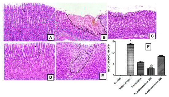A photomicrograph of histopathological changes: (A) Control with normal gastric mucosa (arrow indicates normal parietal cells and double arrow indicates normal surface mucous cells); (B) indomethacin group showing severe degree of coagulative necrotic changes within the gastric mucosa (area above the dotted line) accompanied with deposition of acid hematin (arrow) and inflammatory cell infiltration (arrowheads); (C) famotidine-treated group showing marked decreases in the degenerative and necrotic changes within the gastric mucosa (area above the dotted line); (D) A. anthelmintica extract (200 mg/kg)-treated group showing a marked decrease in the degenerative changes within gastric glands (arrow indicates mild congestion of the gastric capillaries) and few lymphocytes within the surface mucosal lining (arrowhead); (E) A. anthelmintica extract (100 mg/kg)-treated group showing foci of degenerative gastric mucosa (area above the dotted line) revealing few necrotic gastric glands (arrow)), H&E, 100×, bar = 100 µm. (F) Microscopic scores in gastric tissues of rats of different experimental groups. Values are mean ± SEM from 6 samples using Kruskal–Wallis followed by Dunn’s post hoc test. * p < 0.05, compared with control; @ p < 0.05, compared with indomethacin.