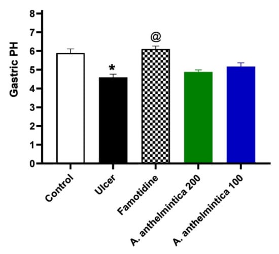 Effects of indomethacin alone or with oral pre-treatments of famotidine, and A. anthelmintica extract (200, 100 mg/kg) on the gastric pH in rats. Statistical analyses were conducted utilizing one-way ANOVA followed by Tukey’s post hoc test, n = 6, mean ± SEM. * Significantly different from control group at p < 0.05. @ Significantly different from indomethacin alone group at p < 0.05.