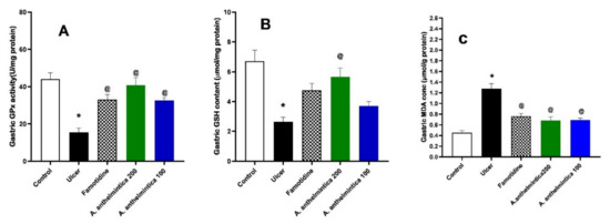 Effects of indomethacin alone and with oral administration of famotidine, or A. anthelmintica extract (200, 100 mg/kg) on (A) gastric glutathione peroxidase activity (GPx), (B) gastric reduced glutathione (GSH), and (C) lipid peroxidation product (malondialdehyde) in rats. Statistical analyses were carried out by one-way ANOVA followed by Tukey’s post hoc test, n = 6, mean ± SEM. * Significantly different from control group at p < 0.05. @ Significantly different from indomethacin alone group at p < 0.05.