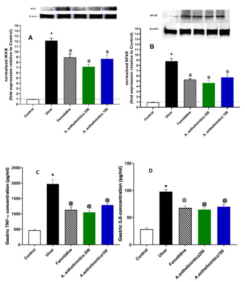 Effects of indomethacin alone and with oral pre-treatments of famotidine or A. anthelmintica (200, 100 mg/kg) on (A) gastric inhibitor of nuclear factor kappa-B kinase subunit beta (IKKB), (B) gastric nuclear factor KB (NF-κB), (C) gastric TNF-α, and (D) gastric IL-6 in rats. Statistical analyses were carried out by one-way ANOVA followed by Tukey’s post hoc test, mean ± SEM. * Significantly different from control group at p < 0.05. @ Significantly different from indomethacin alone group at p < 0.05.