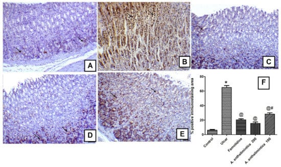 Effects of indomethacin alone and with oral pre-treatments of famotidine or A. anthelmintica (200, 100 mg/kg) on gastric inducible nitric oxide expression (iNOS) in rats. (A) Gastric mucosa of the control group showing scanty immunoexpression of iNOS within the basal parts of the gastric glands (arrows), (B) gastric mucosa of the ulcer group showing marked expression of iNOS within the degenerated gastric glands (arrows), (C) gastric mucosa of famotidine group showing marked decrease the expression of iNOS within the gastric glands (arrows), (D) gastric mucosa of A. anthelmintica (200 mg/kg) group showing marked decrease in the expression of iNOS within the gastric glands (arrows indicate expression within the basal parts of the glands), (E) gastric mucosa of A. anthelmintica (100 mg/kg) group showing a decrease in the expression of iNOS within the gastric glands (arrows), iNOS antibody, bar = 100 µm. (F) Representative bar graph of the percentage of immunopositive area. Statistical analyses were carried out by one-way ANOVA followed by Tukey’s post hoc test, mean ± SEM. * Significantly different from control group at p < 0.05. @ Significantly different from indomethacin (ulcer) group at p < 0.05. # Significantly different from A. anthelmintica (200 mg/kg) group at p < 0.05.