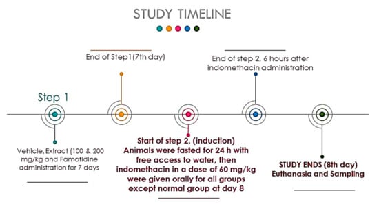 Time course of experimental schedule. Control, ulcer, famotidine, and Albizia anthelmintica extract groups.