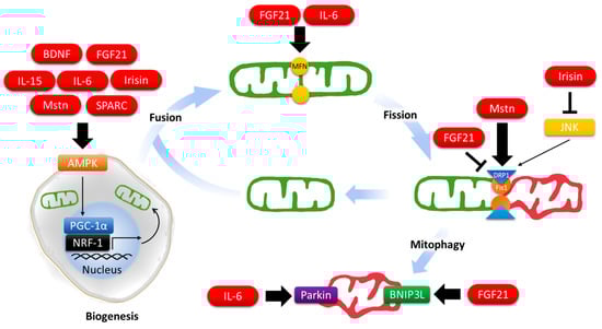 Given the importance of mitochondria in supporting bioenergetics homeostasis, the mitochondrial life cycle is tightly coupled to the cellular concentration of nutrients and ATP via the energy sensors AMPK [41] and mammalian target of rapamycin (mTOR) [42,43]. For instance, AMPK induces mitochondrial synthesis through PGC-1α [44], triggers the formation of autophagosomes by enhancing Unc-51-like kinase 1 (ULK1) activity [45], initiates mitophagy by promoting mitochondrial recruitment of PINK1 [46], and catalyzes mitofission by increasing MFF-DRP1 interaction [47]. Numerous efforts have been put in identifying the signaling cascades and intracellular regulation of the mitochondrial life cycle in the last decades but little is known about how the cells provoke mitochondrial adaptation in response to the extracellular clues. In the following section, we will present examples of myokines that are involved in mitochondrial recycling control (Figure 1).