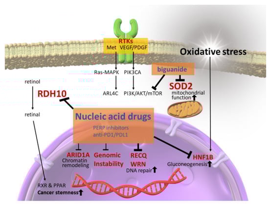 Activating pathways and targeting proposals in ovarian clear cell carcinomas. In ovarian clear cell carcinomas, downstream of receptor tyrosine kinases (RTKs), AT-rich interactive domain 1A (ARID1A)-related chromatin remodeling factors, and genomic instability, including MSI-H, are activated. These are currently being targeted. However, other therapeutic strategies, such as nucleic acid-based drugs, RDH10, RECQL1, WRN, and HNF1B, should be targeted in the future to reduce cancer stemness, induce cancer-specific synthetic lethality, and reduce gluconeogenesis, together with a drug repositioning strategy against SOD2 anti-oxidative stress molecules.