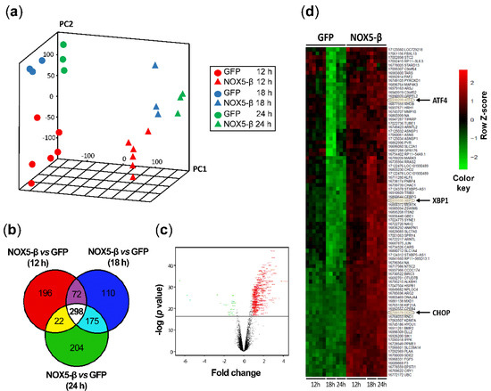 Principal component analysis (PCA) showed a clear difference in sample distribution due to NOX5-β overexpression. There were no differences in sample distribution when comparing time variations (Figure 2a). In addition, the Venn diagram constitutes a graphic representation of the number of genes that were altered (NOX5-β vs. GFP) in each time condition (Tables S1–S3). NOX5-β overexpression resulted in the alteration of 298 genes expression at the three time conditions (Figure 2b; Table S4).