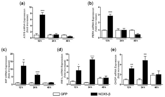 BIP is an immunoglobulin that remains attached to ATF6, PERK and IRE1α. Then, when the UPR is turned on, BIP dissociates and binds to misfolded proteins, acting like a chaperone and allowing sensor activation [40,41]. We found that BIP mRNA and protein expression increased as an early response to NOX5-β overexpression in HAEC. The UPR-triggered adaptive pathway leads to the expression of several chaperones that regulate the protein secretion ratio. Chaperones may also recognize and degrade misfolded proteins and protein aggregates by enhancing proteasome activity [42]. Calnexin and PDI are chaperones that guarantee correct protein folding. Whereas, PDI is a critical player in oxidative folding of ER and extracellular proteins [43], calnexin is a critical regulator of the mitochondria-ER contact site [44]. In the present study, the expression of calnexin was increased early, at 12 h, in NOX5-β-infected cells. On the contrary, PDI suffered no protein expression changes. According to these results, calnexin expression may be influenced by NOX5-generated ROS as an early compensatory mechanism. Additionally, CHOP is a transcription factor activated by the action of ATF6, PERK and IRE1α pathways [43]. This activation is triggered predominantly by PERK, which plays an important role in the induction of cellular apoptosis during ER stress [45]. In the two snapshots (at 12 and 24 h) obtained in this study, although NOX5-β induced upregulation of CHOP mRNA, we detected only a slight increase in its protein levels.