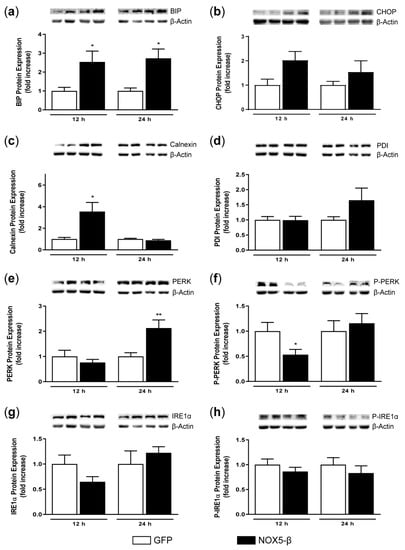 IRE1α and PERK are two of the three sensors that, when misfolded proteins appear, suffer autophosphorylation and subsequently activate the adaptive response or the apoptotic pathway of the UPR [19]. P-PERK was decreased at 12 h, while no differences appeared in PERK levels at this time (Figure 4e,f). NOX5-β adenoviral infection induced an increase in PERK protein expression at 24 h although no differences were found on its phosphorylation. No differences were observed between groups when analyzing IRE1α or P-IRE1α protein expression (Figure 4g,h).