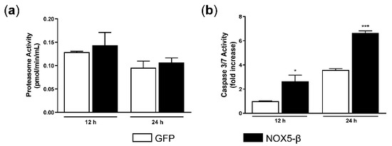 UPR activation could follow an adaptive pathway (proteasome activation) or an apoptotic pathway [18]. We found no differences in proteasome activity between GFP- and NOX5-β-infected (Figure 5a). However, NOX5-β overexpression increased apoptosis at 12 h and 24 h (Figure 5b). This assay may indicate that NOX5-β overexpression in HAEC and its consequent ROS production leads to apoptosis.