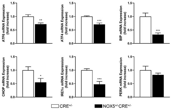 Cardiac UPR components mRNA expression in control CRE mice (CRE+/−) and mice expressing NOX5-β in endothelial cells (NOX5+/−CRE+/−) was analyzed. In our experimental conditions, 6–8 weeks after tamoxifen induction of NOX5+/−CRE+/− mice, ATF6, ATF4, CHOP, BIP and IRE1α were downregulated compared with control mice (Figure 6).