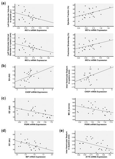 Correlations between IRE1α and the echocardiographic parameters resulted in four significant interactions. The analysis showed a negative correlation of IRE1α gene expression with the left ventricular volume and the left ventricular internal diameter both in systole. Additionally, a positive correlation of IRE1α gene expression was obtained with the ejection fraction and fractional shortening, both indicators of cardiac function (Figure 7a). Additionally, CHOP gene expression positively correlated with the EA, an indicative parameter of the left ventricle filling, and with the inter-ventricular septum in systole (Figure 7b). PERK showed a negative correlation with EE’, an indicator of diastolic dysfunction, and MV E (Figure 7c). BIP also negatively correlated with EE’ (Figure 7d). Finally, we found a negative correlation between ATF6 and the inter-ventricular septum in diastole (Figure 7e).