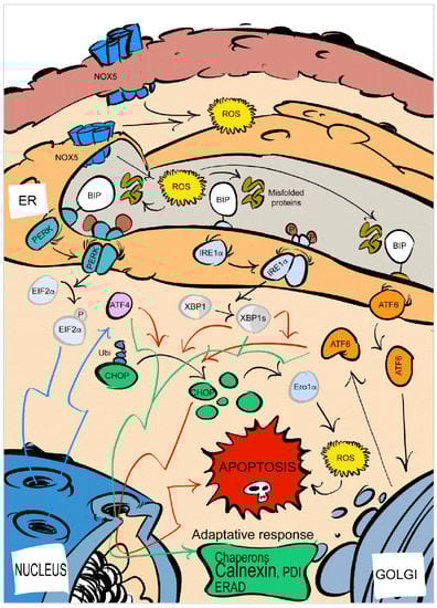 UPR schematic representation and the possible influence of NOX5-derived ROS. ER, endoplasmic reticulum; ROS, reactive oxygen species; ERAD, endoplasmic-reticulum-associated protein degradation; Ubi, ubiquitination; P, phosphate.
