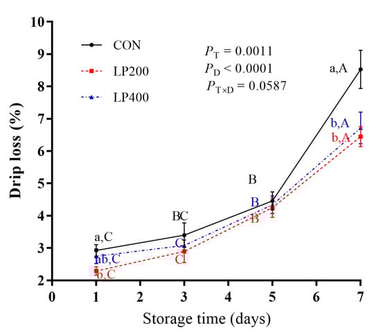 Effect of dietary lycopene supplementation on drip loss (on days 1, 3, 5 and 7) of longissimus thoracis (LT) muscle in lamb meat during storage (n = 10). PT, P-value of treatments; PD, P-value of storage days; PT×D, P-value of the interaction between treatments and storage days. Different capital letters indicate significant differences (P < 0.05) among storage time within treatment, and lowercase letters denote significant differences (P < 0.05) among treatments within time. The error bars represent standard error. CON, control group; LP200 and LP400 mean 200 or 400 mg·kg−1 lycopene powder supplementation in the control diet, respectively.