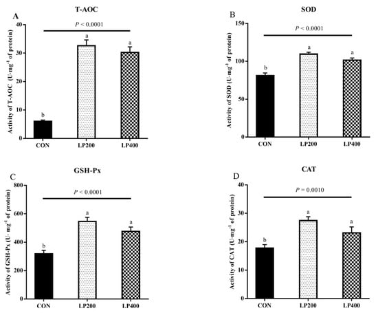 Effect of dietary lycopene supplementation on activities of antioxidant enzymes (on day 0)—total antioxidant capacity (T-AOC) (A), superoxide dismutase (SOD) (B), glutathione peroxidase (GSH-Px) (C) and catalase (CAT) (D) (n = 10). Different lowercase letters denote significant differences (P < 0.05) among treatments. The error bars represent standard error. CON, control group; LP200 and LP400 mean 200 or 400 mg·kg−1 lycopene powder supplementation in the control diet, respectively.