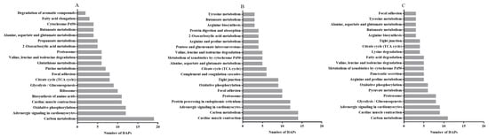 The 20 most enriched pathways of DAPs by Kyoto Encyclopedia of Genes and Genomes (KEGG) analysis between the CON and LP groups on days 0 (A), 5 (B) and 7 (C), arranged according to the number of DAPs. DAPs: differentially abundant proteins.