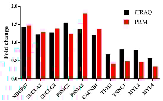 Verification of iTRAQ DAPs by using PRM analysis. NDUFS7, NADH: ubiquinone oxidoreductase core subunit S7; SUCLA2, Succinate-CoA ligase, ADP-forming, subunit beta, mitochondrial; SUCLG2, Succinate-CoA ligase, GDP-forming, subunit beta, mitochondrial; PSMC2, Proteasome 26S subunit, ATPase 2; PSMA3, Proteasome subunit alpha type; CACNB1, Calcium voltage-gated channel auxiliary subunit beta 1; TPM3, Tropomyosin 3; TNNC1, Troponin C1, slow skeletal and cardiac type; MYL2 and MYL4, Myosin light chain 2 and 4. iTRAQ: isobaric tags for relative and absolute quantitation; PRM: parallel reaction monitoring.