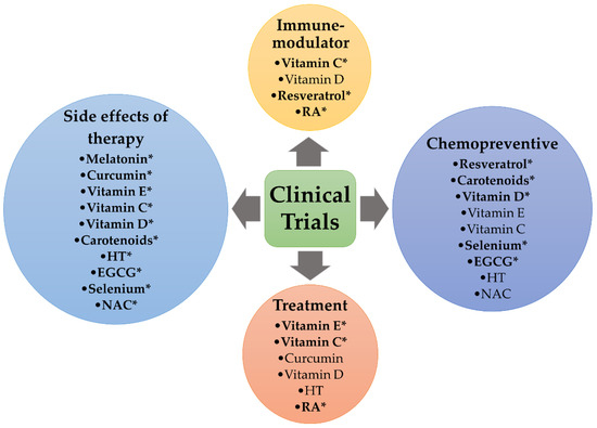 The effectiveness of natural products, including phenolics, flavonoids, carotenoids, etc., has shown to suppress early and late-stages of carcinogenesis, reflecting their ability to counteract certain upstream signals, such as genotoxic damage redox imbalances, and other forms of cellular stress. Epigenetic agents alone or in combination with conventional anticancer drugs may prove a significant advance [33]. There are many different dietary, synthetic and endogenous antioxidants that are being widely investigated. Nevertheless, we will focus herein on those with a high potential to be used as therapeutic agents for breast cancer in both preclinical and clinical studies, namely natural dietary antioxidants like melatonin, resveratrol, curcumin, vitamin E, vitamin C, vitamin D, carotenoids, hydroxytyrosol, epigallocatechin gallate, selenium and some synthetic antioxidants. We describe the clinical trials (registered or not in ClinicalTrials.gov) focused on antioxidant supplementation as plausible monotherapy or adjuvant therapy, as well as the most significant trials aimed to ameliorate therapy-derived side effects.