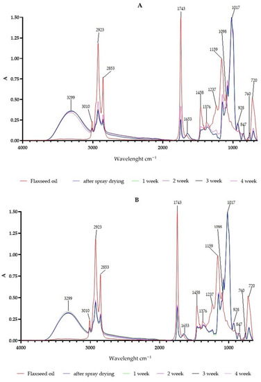 FTIR spectra of fresh flaxseed oil, powders with 10% (A) and 20% (B) and flaxseed oil, directly after spray drying, and after 1, 2, 3, and 4 weeks of storage.
