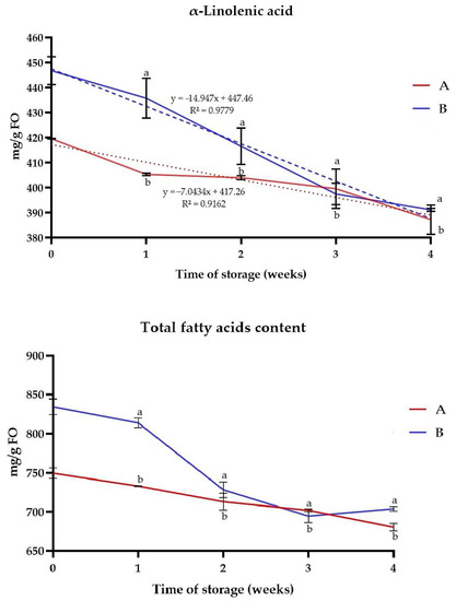 Changes of ALA and fatty acids content in powders containing 10% (A) and 20% (B) of FO. Means with different lowercase letters are significantly different at p < 0.05.