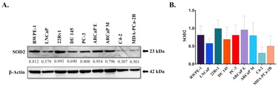 Overview of Superoxide Dismutase 2 (SOD2) protein expression in prostate cancer cell (PCa) panel. (A) SOD2 expression was probed using western blot analysis of whole cell lysate (30 µg/mL) in a prostate cell panel. β-Actin was used as a loading control. (B) Quantification of western blot analysis was performed using Image J (National Institutes of Health- NIH) normalized to β-Actin. Results are representative of triplicate experiments performed at least twice independently.