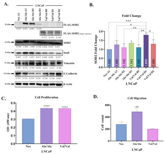 Overexpression of Ala-SOD2 SNP complementary DNA (cDNA) in LNCaP cells leads to increased epithelial-mesenchymal transition (EMT), cell growth, and migration. Ala-, Val-SOD2, or empty vector (Neo) cDNA, were stably transfected into LNCaP cells. (A) Western blot analysis of FLAG-SOD2, total SOD2 (exogenous and exogenous) and EMT markers (Snail, vimentin, E-cadherin) was performed. Data indicated that Ala-SOD2 (Ala/Ala)-expressing cells are more effective than Val-SOD2 (Val/Val)-expressing cells, at inducing EMT (higher Snail and vimentin; lower E-cadherin). β-Actin was used as a loading control. (B) Real-time polymerase chain reaction (PCR) analysis was performed for stable transfectants of LNCaP cells with Neo, Ala- or Val-SOD2 cDNA (Ala/Ala and Val/Val). Baseline (C) cell proliferation and (D) cell migration in untreated Neo (empty vector) control and SOD2-overexpressed LNCaP cells were analyzed. Statistical significance (one-way analysis of variation -ANOVA) of differences between Neo control and SOD2 SNP-overexpressed cells was determined using GraphPad Prism p < 0.05 (*), p < 0.01 (**), p < 0.001 (***), p < 0.0001 (****). Results are representative of triplicate experiments performed at least twice independently.