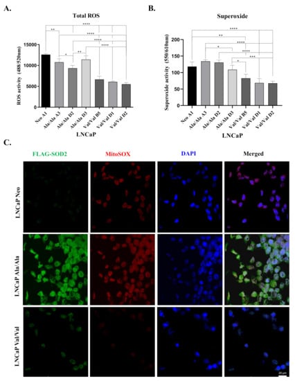 Stable overexpression of Ala-SOD2 SNP displays higher reactive oxygen species (ROS) compared to Val-SOD2 SNP in prostate cancer cells. (A) Total ROS levels, which includes overall oxidative stress in the form of intracellular levels of hydrogen peroxide, hydrogen peroxide (H2O2), peroxynitrite (ONOO−), hydroxyl radicals (HO), nitric oxide (NO), and peroxy radical (ROO), were measured using the ROS-ID Total ROS/Superoxide Detection kit in LNCaP cells that were stably transfected with Ala- or Val-SOD2 cDNA. (B) Superoxide (O2−) levels were measured using Superoxide Detection Solution from the ROS-ID Total ROS/Superoxide Detection kit. (C) LNCaP Neo and SOD2 SNP-overexpressing cells were utilized for immunofluorescent analysis of exogenous SOD2 using FLAG antibody (green), superoxide using MitoSOX stain (red), and 4′,6-diamidino-2-phenylindole (DAPI) (blue) for nucleus. Cells overexpressing Ala-SOD2 (Ala/Ala) were shown to have higher levels of FLAG and superoxide when compared to Neo and Val-SOD2 (Val/Val) cells. The statistical significance of differences (one-way ANOVA) for the ROS and superoxide data was analyzed by GraphPad Prism and shows p < 0.05 (*), p < 0.01 (**), p < 0.001 (***), p < 0.0001 (****) from experiments performed in triplicate at least twice independently. Magnification 40×. Scale bar = 20 µm.