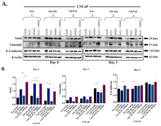 Previously in our lab, we demonstrated that MSKE was able to revert Snail-mediated EMT in PCa cells by antagonizing superoxide species []. Since superoxide is increased in cells overexpressing Ala-SOD2, we investigated whether MSKE would antagonize Ala-SOD2 SNP-mediated EMT. In the present study, we showed (by western blot analysis) that by day three of treatments, the Ala-SOD2 clone showed decreases in both Snail and vimentin expression after treatments with MSKE, when compared to the Ala-SOD2 Day 0 EtOH control and MSKE treatment (Figure 4A,B, Supplementary Table S1). This trend of decreased Snail expression was also exhibited in Val-SOD2 SNP cells when compared to the Val-SOD Day 0 EtOH and MSKE treatment (Figure 4A,B, Supplementary Table S1). E-cadherin expression was shown to increase, following MSKE treatment, for the Neo control and SOD2-SNP representative clones when compared to the Day 0 EtOH and MSKE treatment of each clone type. These results show that MSKE can inhibit EMT in Ala-SOD2 SNP-overexpressing LNCaP cells.