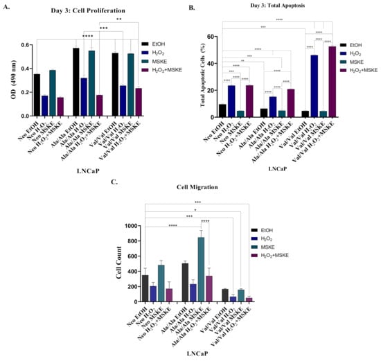 We have previously described that MSKE promotes apoptosis in C4-2 PCa cells []. H2O2 has also been shown to decrease cell proliferation and send cells towards apoptosis []. We sought to examine whether MSKE would antagonize Ala-SOD2 and/or Val-SOD2 SNP-mediated cell proliferation/migration and affect apoptosis. Representative SOD2-SNP stably transfected LNCaP cells were treated with both individual and coupled treatments of H2O2 and MSKE; with EtOH serving as an experimental control. An MTS assay performed over a three-day period showed that treatment with H2O2 alone and H2O2 coupled with MSKE led to significant decrease in cell proliferation for Neo, Ala-SOD2 and Val-SOD2 representative clones, when compared to EtOH controls (p < 0.0001) (Figure 5A, Supplementary Figure S4). However, MSKE alone did not affect cell viability (Figure 5A, Supplementary Figure S4). However, the coupling of H2O2 and MSKE showed a greater decrease in cell viability compared to H2O2 alone, for only Ala-SOD2 SNP-overexpressed cells, suggesting an additive effect (Figure 5A, Supplementary Figure S4). Next, apoptotic analysis of treated cells was performed. The use of 20 µg/mL MSKE has been previously cited in literature to promote apoptosis in PCa cells []. Interestingly, we observed that by day three of treatment, coupling 20 µg/mL MSKE with H2O2 (H2O2 + MSKE) induced significantly increased total apoptosis in Ala-SOD2 and Val-SOD2 cells at p < 0.0001, when compared to Neo-, Ala-SOD2-, and Val-SOD2 EtOH-treated cells, respectively (Figure 5B). Therefore, co-treatment of H2O2 and MSKE in SOD2 SNP-overexpressed LNCaP cells promotes apoptosis, while also decreasing cell proliferation. In our analysis of cell migration, when compared to the EtOH control, significant decreases were seen in Ala-SOD2 and Val-SOD2 cells treated with H2O2 alone, that were not decreased any further by combination H2O2 + MSKE (Figure 5C). To our surprise, MSKE alone did not decrease cell migration and in fact, Ala-SOD2 cells showed a significant increase in migration (Figure 5C, Supplementary Figure S5). Altogether, this data suggests that SOD2-overexpressed cells may benefit more from treatment with H2O2 alone or in combination with MSKE, rather than MSKE alone as originally hypothesized.
